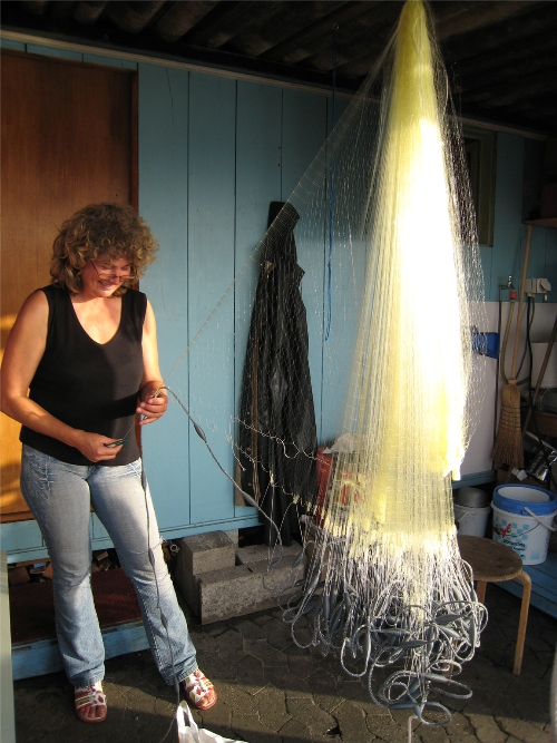 Un groupe de 3-4 hommes regardaient une femme réparer un filet.