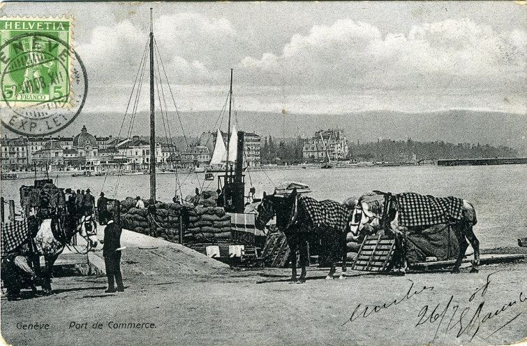 Quai des Eaux-Vives, chargement de marchandises sur un petit vapeur (1908). Carte postale. Collection personnelle.