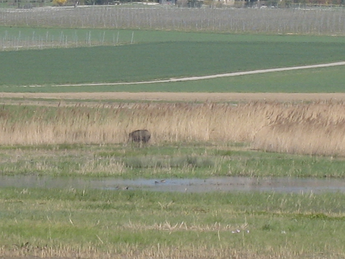 C'est un sanglier qui se ballade en plein jour au milieu de la campagne.