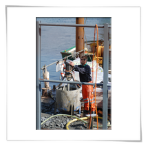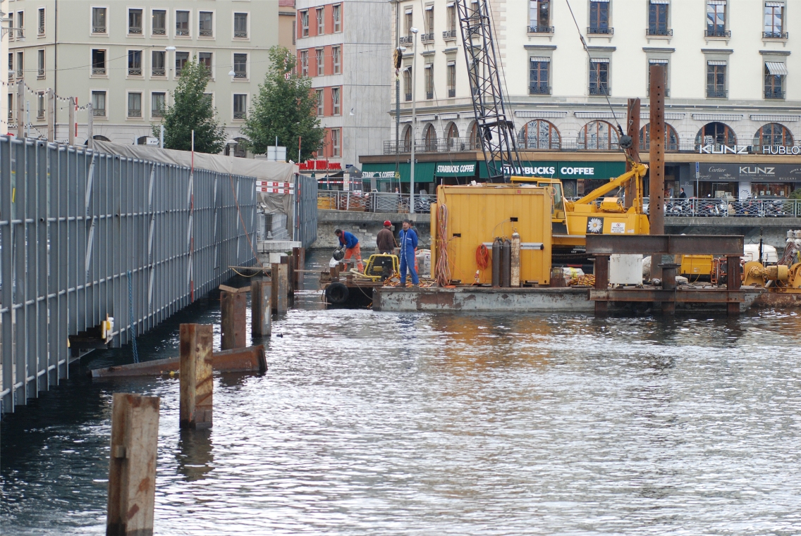 Les travaux se faisant majoritairement sur l'eau, les moyens sont donc adaptés: barges, plongeurs, etc.