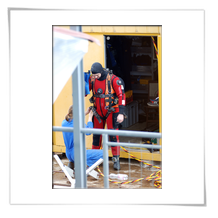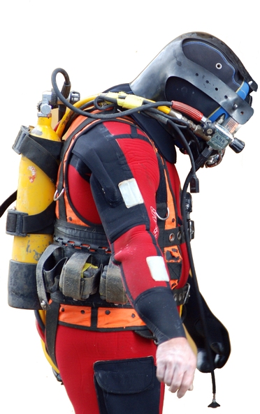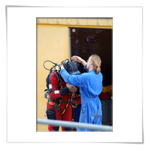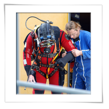 L'équipement est classique: narguilé avec intercom, biberon de secours, facial (Kirby-Morgan) et harnais pro (surlesté).