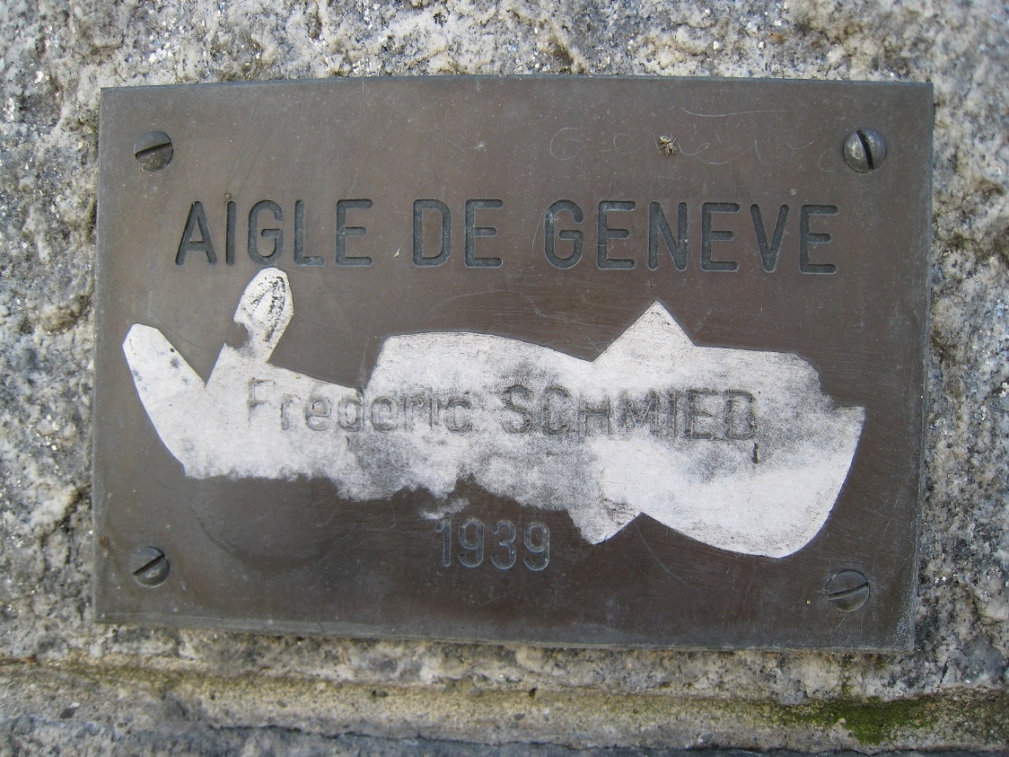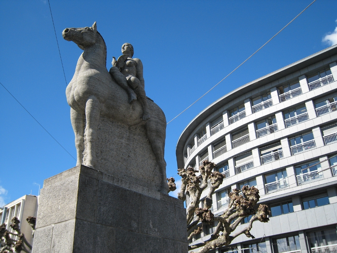 A chaque extrémité se dresse une statue de cavalier (un homme, une femme) acompagné d'un aigle.