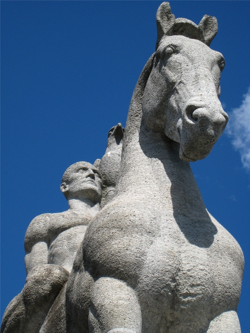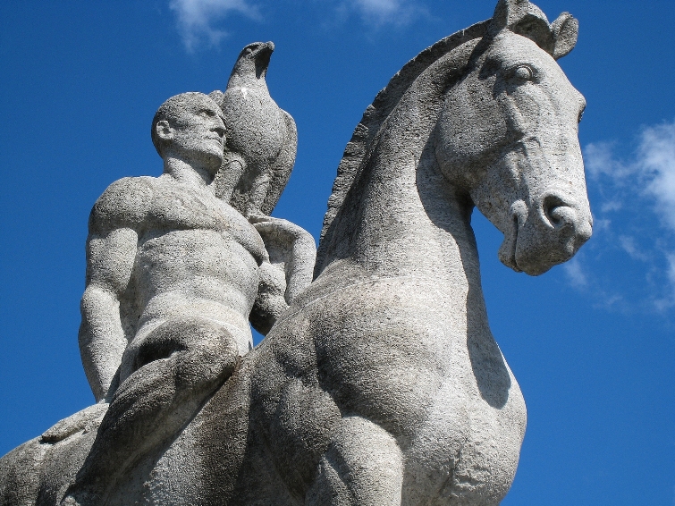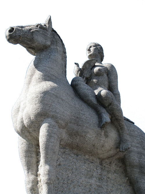 A chaque extrémité se dresse une statue de cavalier (un homme, une femme) acompagné d'un aigle.