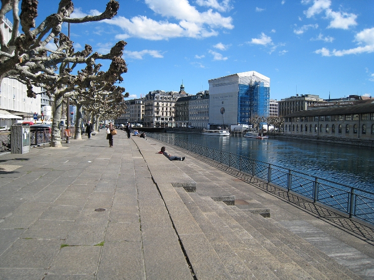 Coincé entre Rhône et l'architecture massacrée de St-Gervais, le lieu est devenu "branché" grâce...à des chaises longues que propose un débit de boisson à la belle saison.