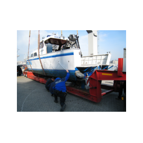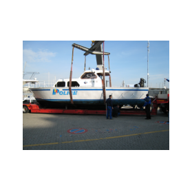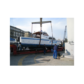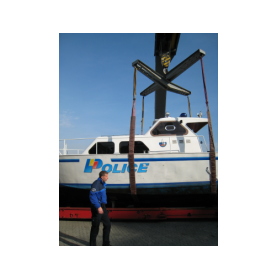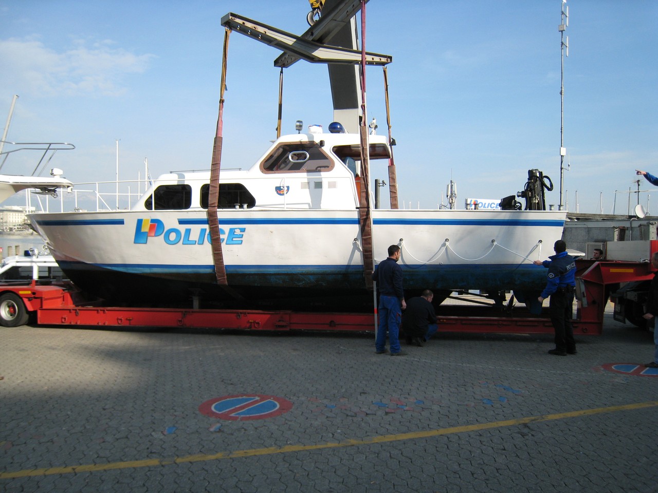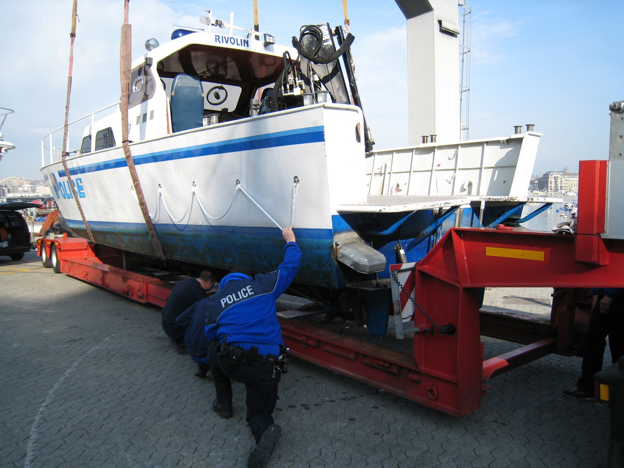 Sortie de l'eau pour une des vedettes de la police du lac. Bel engin ! L'équipement des plongeurs étant généralement lourd, le bateau est équipé d'un bras hydraulique. Ca aide parfois.