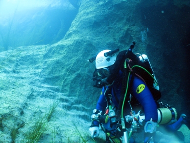 Casque, palmes, blocs, tout y est. Mise à l'eau et descente au fond de la vasque sous O2 uniquement.