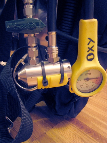 A gauche: les supports des bouteilles sont fixés sur le corps de l'EDO par des cerclages inox, la stab et la plaque par des sangles classiques de stab (pour pouvoir les enlever facilement.