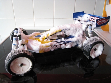 Mon 1er essai dans la neige...La protection n'est pas assurément très pro mais a le mérite de l'efficacité (pour un temps du moins). Objectif avoué: ne pas répéter la même erreur que sur l'Inferno VE. Seul problème, mais de taille, la voiture n'a pas assez de garde au sol pour rouler dans une neige moyennement compacte.