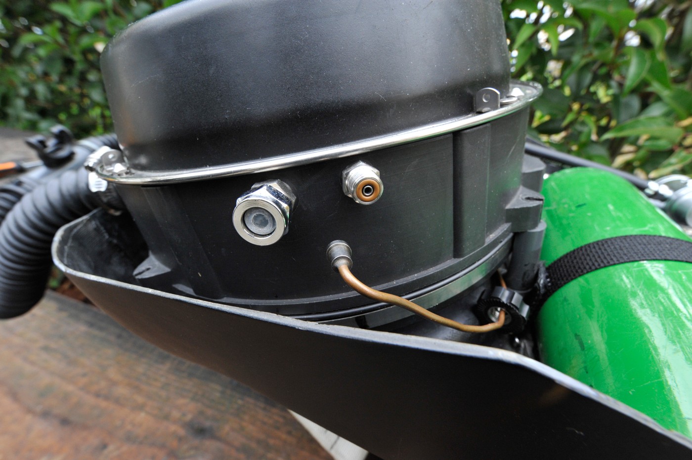 essai du recycleur o2 dorsal de Marc...une base étrange de caisse de MK15.5 modifiée avec des éléments de recycleur de pompier US (filtre et bloc)