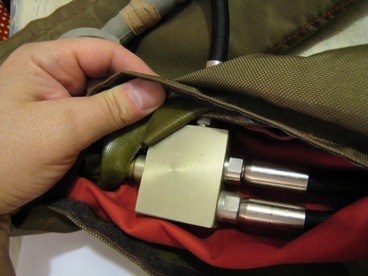 Une commande manuelle permet de gonfler le gilet. Un deuxième étage de belle fabrication placé derrière la nuque offre environ 1 heure d'autonomie si l'utilisateur se retrouve immergé. De mémoire, Tajfun est une entreprise tchèque qui fabriquait du matériel de plongée.