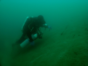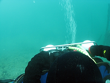Le manque de visibilité et mon problème de filtre ne m'ont pas encouragé à suivre Mike jusqu'au bord de la falaise. Arrêt à -66m, retour et début de mes paliers à -40m...où je me suis amusé à faire sonner la cloche. Ce sera d'ailleurs grâce à cette dernière que je retrouverai mon binôme plus tard !