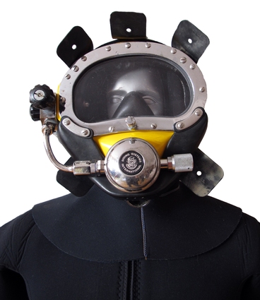 The fully tested and certified KMB 18 & 28 BandMasks® may be used in mixed gas diving as well as shallow water diving. The SuperFlow® adjustable demand regulators provide low inhalation resistance and high gas flow letting the diver breathe easier and work harder with less exertion. Both masks come standard with the large tube SuperFlow® 350 regulator. The Side Block Assembly of both the KMB 18 and 28 receives the umbilical over the shoulder in the B configuration. They both come standard with the Tri-