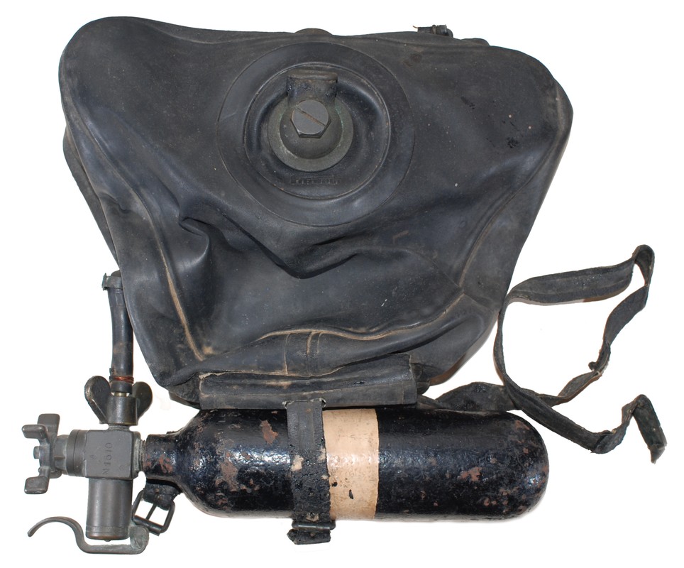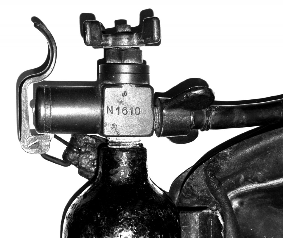 Le facial, en caoutchouc, se fixe avec 2 dragonnes. Le DSV à 3 voies (manquant) permettait le passage du recycleur à l'air de surface via son drôle de tuba. Un étrange petit réservoir d'air en caoutchouc a été rajouté par collage sur le dessus de la tête. Il communique avec le volume du facial via un petit tuyau. Une tentative d'équilibrage "automatique" qui ajoute surtout un élément de fragilité au facial.