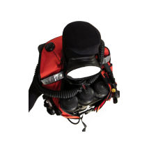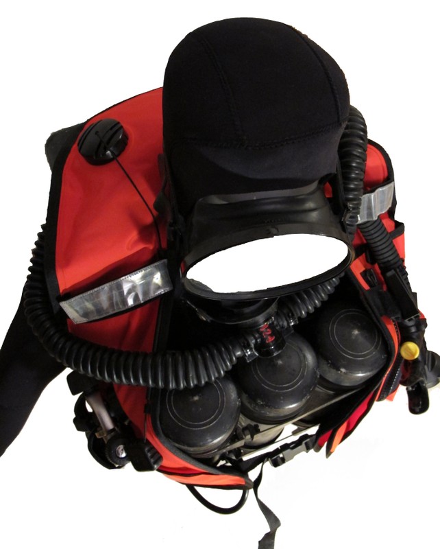 3 blocs alu de 1.5L à 200b portés en ventral contiennent le gaz de fond. Ils sont reliés par un gas block (une barre de liaison) qui permet d'utiliser un seul détendeur et d'équilibrer les pressions dans les 2 bouteilles actives, la dernière étant - d'après ce que j'ai compris - gardée en réserve. A noter que certains modèles, le MIXGERS 72 (l'ancêtre), n'a un gas block que pour 2 blocs. Si qqn peut m'éclairer sur ces différences, je suis preneur...Les blocs sont recouverts sur les versions modernisées (dès 1997) d'une protection néoprène qui évite aux robinets d'accrocher qqch au passage. Un 2ème étage SPIRO de secours (manquant ici) fait aussi partie du lot (un SUPRA dès sa modernisation). La partie recycleur à proprement parler est portée en dorsal. L'ensemble fait corps grâce à un harnais aussi simple qu'efficace. Principe d'injection et détendeur(s) FENZY mis à part, le MIXGERS diffère en tout du DC55: filtre, bloc, faux-poumon ou encore carénage sont différents. Le MIXGERS souffrait d'une résistance respiratoire importante et n'était pas spécialement apprécié de la troupe pour ses qualités sous l'eau.